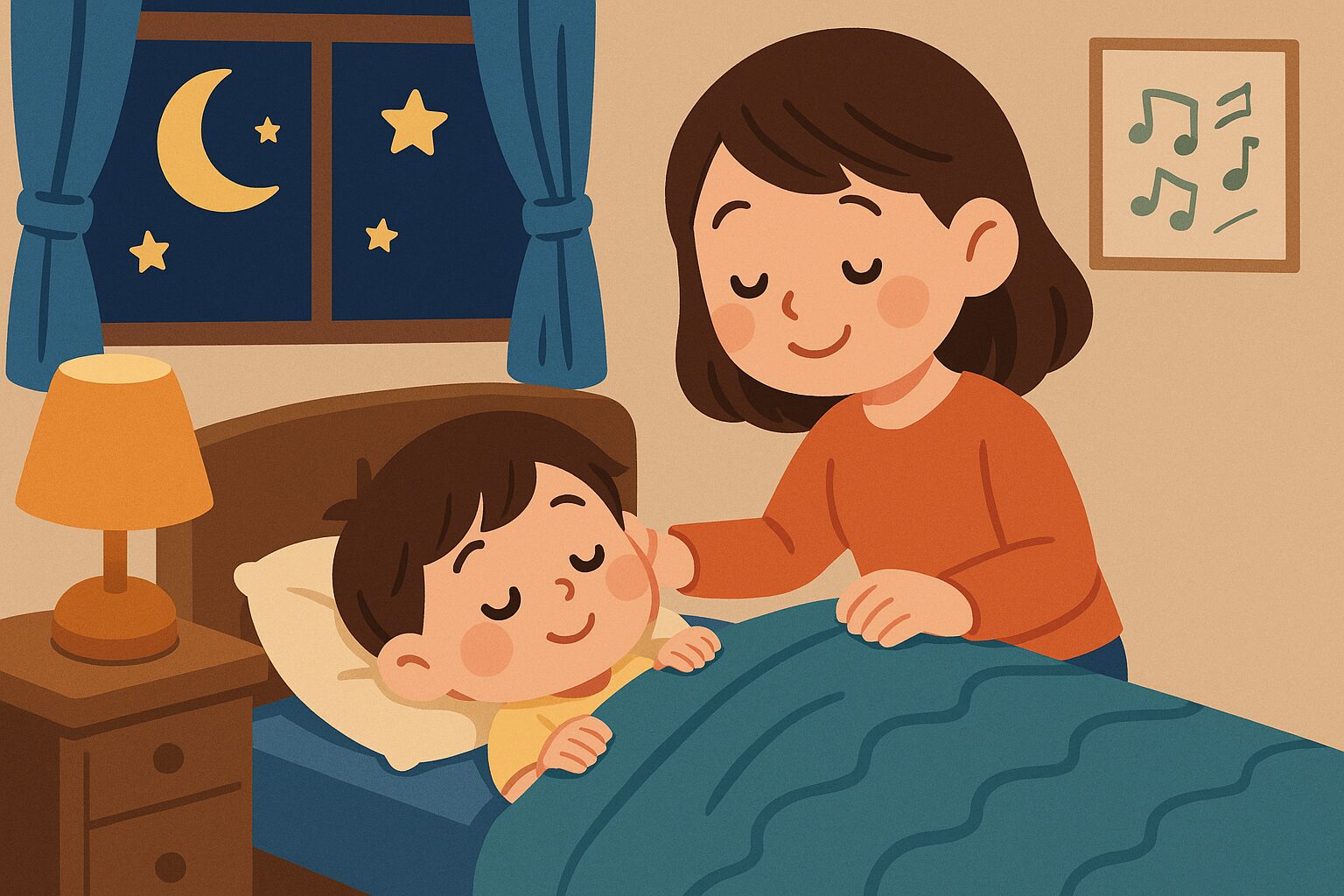 寝る30分前になったら照明を落とし、「おやすみモード」に切り替えましょう。 部屋の明かりを落とすことで、副交感神経が優位になり、自然に眠気が訪れます。 さらに、親子で本を読む・静かな音楽を流すなど、光刺激を抑えた穏やかな時間を過ごすと、入眠までがスムーズになります📖